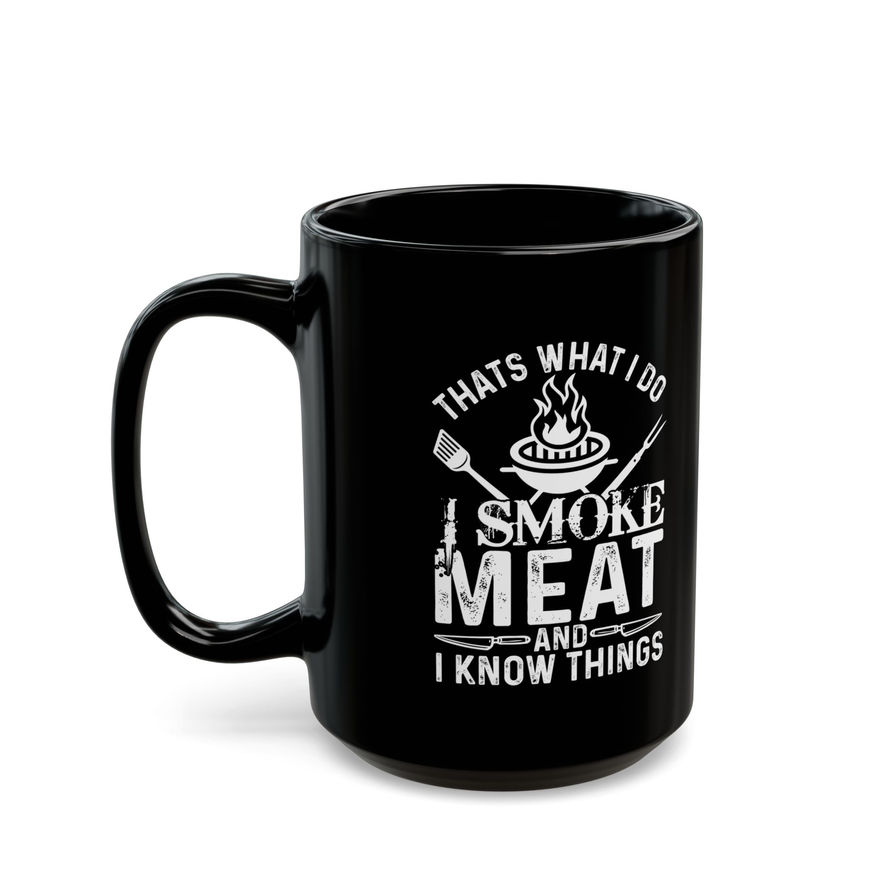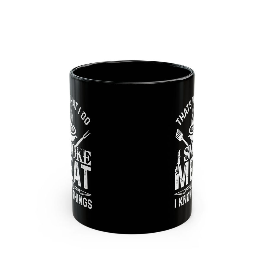Kickstart your day with a chuckle and a brew with our edgy, I Smoke Meat - That's What I Do And I Know Things, black ceramic mug. Perfect for meat-smoking maestros, this durable, stylish mug adds a punch of personality to your morning routine.